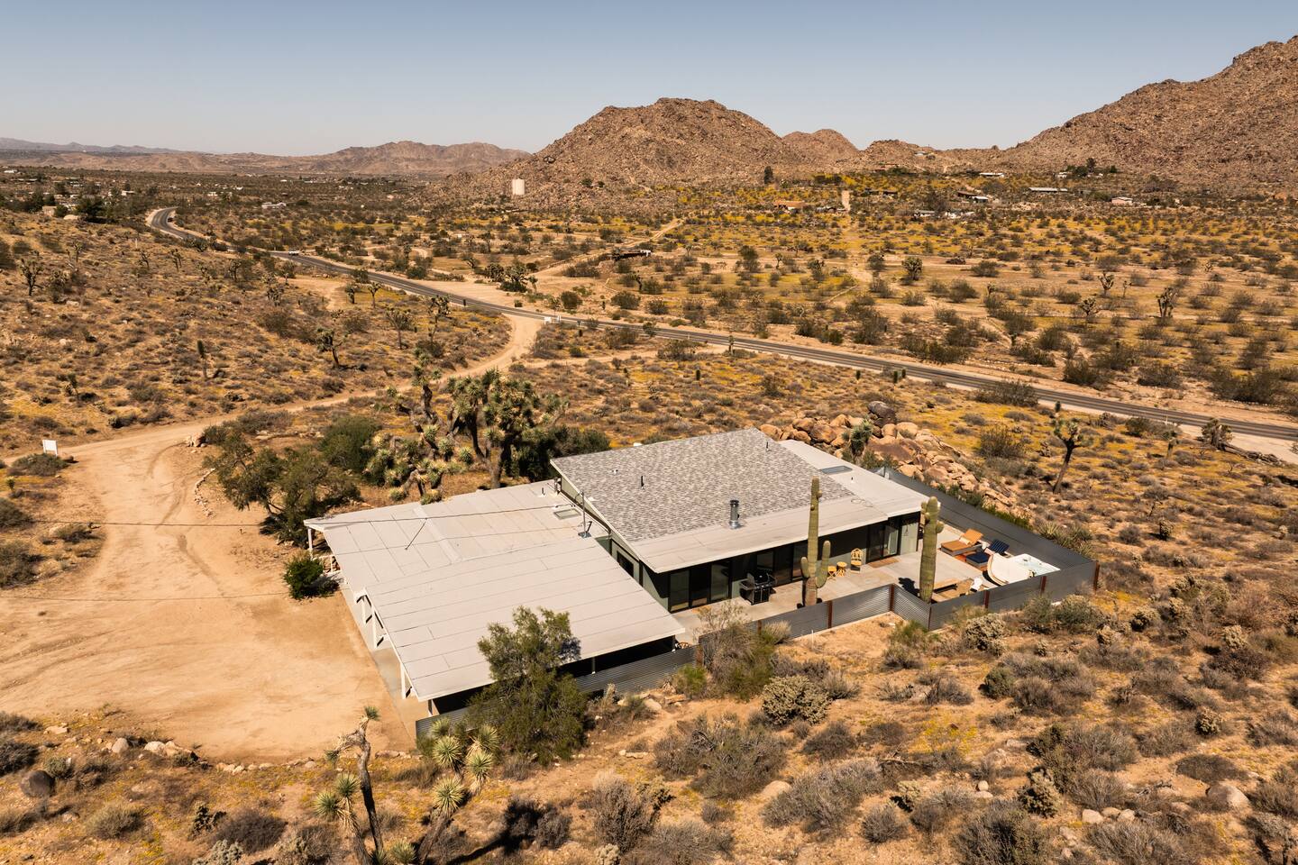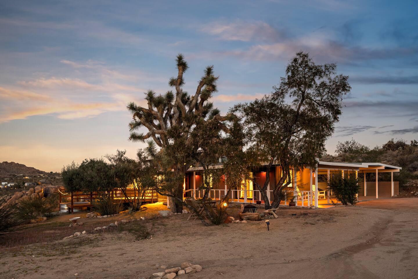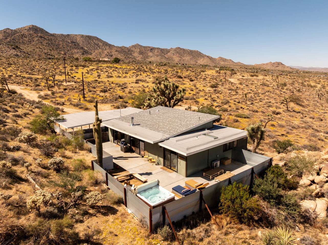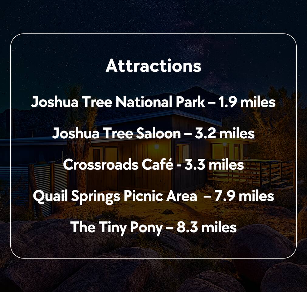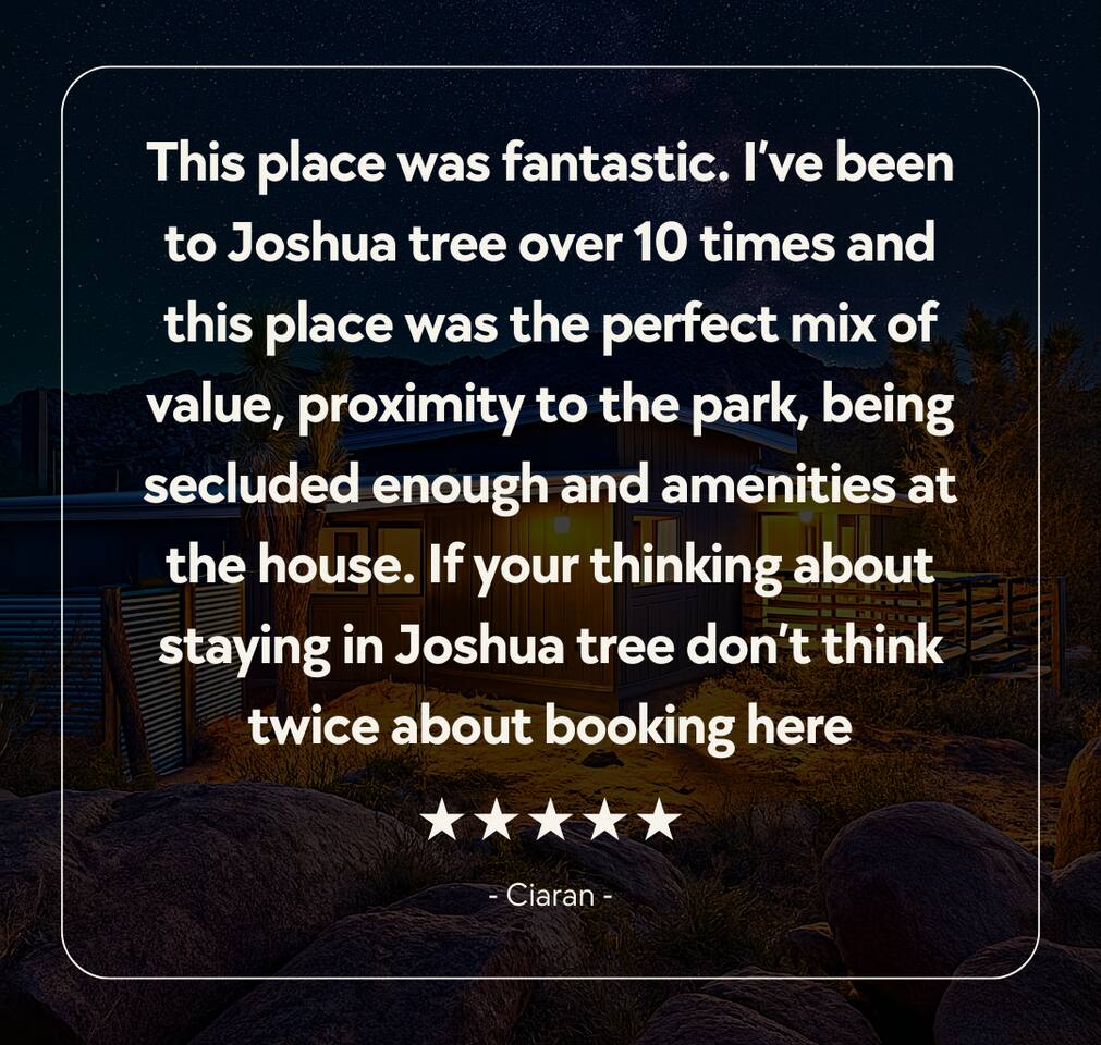 ☆☆ HIGHLIGHTS ☆☆ ✹ Designer property: recently redesigned by architect Duane Smith ✹ Total privacy in the heart of the desert: 2.5 private acres of solitude ✹ 3 spacious bedrooms: 2 kings + 1 queen ✹ 2 full bathrooms: essential toiletries provided ✹ Full kitchen w/ modern appliances ✹ Complimentary coffee bar ✹ Family-friendly: high chair, pack n’ play, children’s dinnerware, and more ✹ Spacious living area w/ flat-screen smart TV, record player, piano + more ✹ High-speed wifi + dedicated workspace ✹ Private hot tub + Cowboy Pool built into extensive front porch ✹ Panoramic views of the mountains + desert ✹ BBQ grill + outdoor dining space ✹ SoloStove firepit with 4 Adirondack chairs ✹ Lounge space in the sun + shade ✹ Dark skies: perfect for stargazing ✹ Pet-friendly ✹ A/C and heating throughout the home ✹ Washer + dryer ✹ Free parking: a covered area for 2 vehicles + additional parking in the driveway ✹ Local recommendations from the host ✹ Daily housekeeping available (subject to additional fees) ✹ Easy access to local attractions: minutes to the national park entrance Eager to Read More? Here Are A Few Kind Words From Our Previous Guests: “An absolute gem of a home located minutes away from the front gates a Joshua tree. It is rare to find an air bnb where you immediately feel “at home” upon walking inside. The design of this home has so much character and charm with an obvious attention to detail. The hosts are very accommodating and wanted us to have the best experience possible. We are fairly local and are already planning our trip back.” - Cris “This home was spotless, beautifully decorated, and exactly as described. Amazing views off the front porch of the surrounding mountains. The location was ideal—super close to the west gate of Joshua Tree park and also close to restaurants and shops in town, but still quiet and peaceful. The host was incredibly responsive and friendly, and provided excellent local recommendations. The beds were super comfortable, Wifi was great speed for a desert home, a fully stocked kitchen, and enclosed outdoor space felt very private and serene. It had two of the biggest cacti I’ve ever seen up close! We’d definitely stay here again and highly recommend it to anyone looking for a relaxing and hassle-free experience!” - Nick “This place was fantastic. I’ve been to Joshua tree over 10 times and this place was the perfect mix of value, proximity to the park, being secluded enough and amenities at the house. If your thinking about staying in Joshua tree don’t think twice about booking here” - Ciaran ★★ BEDROOMS ★★ Three sun-soaked bedrooms provide a bright and airy space to relax after a long day on the go. Each bedroom boasts a comfortable bed, extra pillows and blankets, and blackout curtains to help you enjoy a restful night even when you want to sleep in! Bedroom 1: King-sized bed, ensuite bathroom, direct access to front patio Bedroom 2: King-sized bed Bedroom 3: Queen-sized bed, direct access to outdoor patio ✔ Extra pillows + blankets ✔ A/C in each bedroom ✔ Blackout curtains ★★ BATHROOMS ★★ The primary bedroom has a charming bathroom, and one additional full bath is located off the main living area. Both bathrooms are sparkling clean and beautifully decorated to provide a relaxing experience. Don’t miss bathing in the clawfoot tub directly under a skylight with a view of the incredible starry sky! ✹Bathroom 1: Ensuite to the primary bedroom with a clawfoot bathtub, massive walk-in shower, and dual sinks ✹Bathroom 2: Full bathroom with a walk-in shower ✔ Essential toiletries provided (including shampoo, conditioner and body wash) ✔ Hair dryer ✔ Fresh towels ✔ Laundry room ★★ KITCHEN & DINING ★★ The modern kitchen is a chef’s dream with stainless steel appliances, spacious countertops, and an open concept that makes it easy to mingle with the whole group even while preparing meals. ✔ Fully stocked kitchen w/ modern appliances ✔ Complimentary coffee bar ✔ Basic cookware & dinnerware ✔ Oversized dining table w/ seating for 8 ✔ High chair for kids ★★ LIVING ROOM ★★ Featuring an expansive lounge space, this home offers plenty of opportunities to relax in between exploring nearby attractions. Sink into the comfy sofa and stream your favorite shows and movies on the flat-screen smart TV, or enjoy a digital detox as you read a book, spin some vinyl, or play a tune on the piano. ✔ Multiple lounge spaces w/ comfy sofas + chairs ✔ Dedicated workspace ✔ Decorative fireplace ✔ Piano + vinyl player ✔ Flat-screen smart TV ✔ Books + boardgames ★★ OUTDOOR SPACE ★★ The inside of the home is a design lover's dream, and the outdoor space is a sanctuary for nature lovers. Admire the starry night sky and Milky Way, unwind in the private hot tub, or soak up the sun from a lounger. Sweeping views surround the entire property, making this private desert retreat the perfect destination. ✔ Private hot tub + cowboy pool ✔ Sun loungers ✔ BBQ grill + outdoor dining ✔ Stunning views of the desert + mountains ✔ Dark skies: perfect for stargazing ★★ ACTIVITIES/ATTRACTIONS ★★ Once you’re ready to get out and explore the high desert, you’ll find nearby attractions like the national park and downtown Joshua Tree just a stone’s throw away. Here are some of our favorite activities and attractions nearby: Outdoor & Nature Activities Explore iconic desert landscapes, scenic hikes, and wildlife viewing spots: ✔ Joshua Tree National Park West Entrance – 1.9 miles ✔ Barker Dam Trail – 6 miles ✔ Hidden Valley – 11.2 miles Art & Culture Discover Joshua Tree's vibrant art scene and unique installations: ✔ Joshua Tree Art Gallery (JTAG) – 3.4 miles ✔ Noah Purifoy Outdoor Desert Art Museum – 8.8 miles ✔ Art Queen & World Famous Crochet Museum – 3.2 miles ✔ La Matadora Gallery – 3.3 