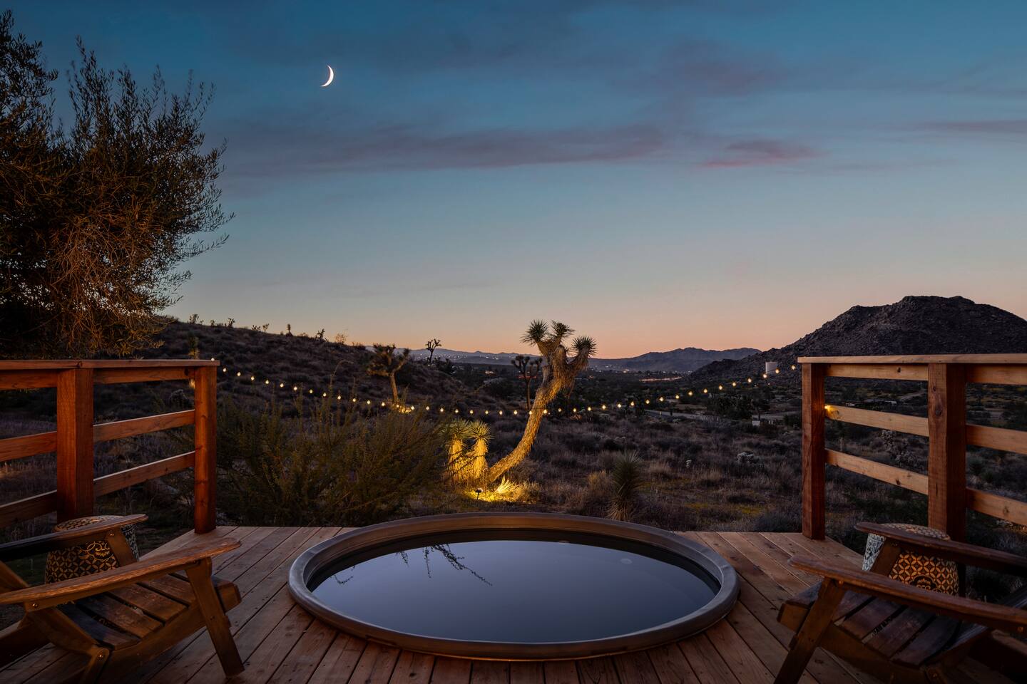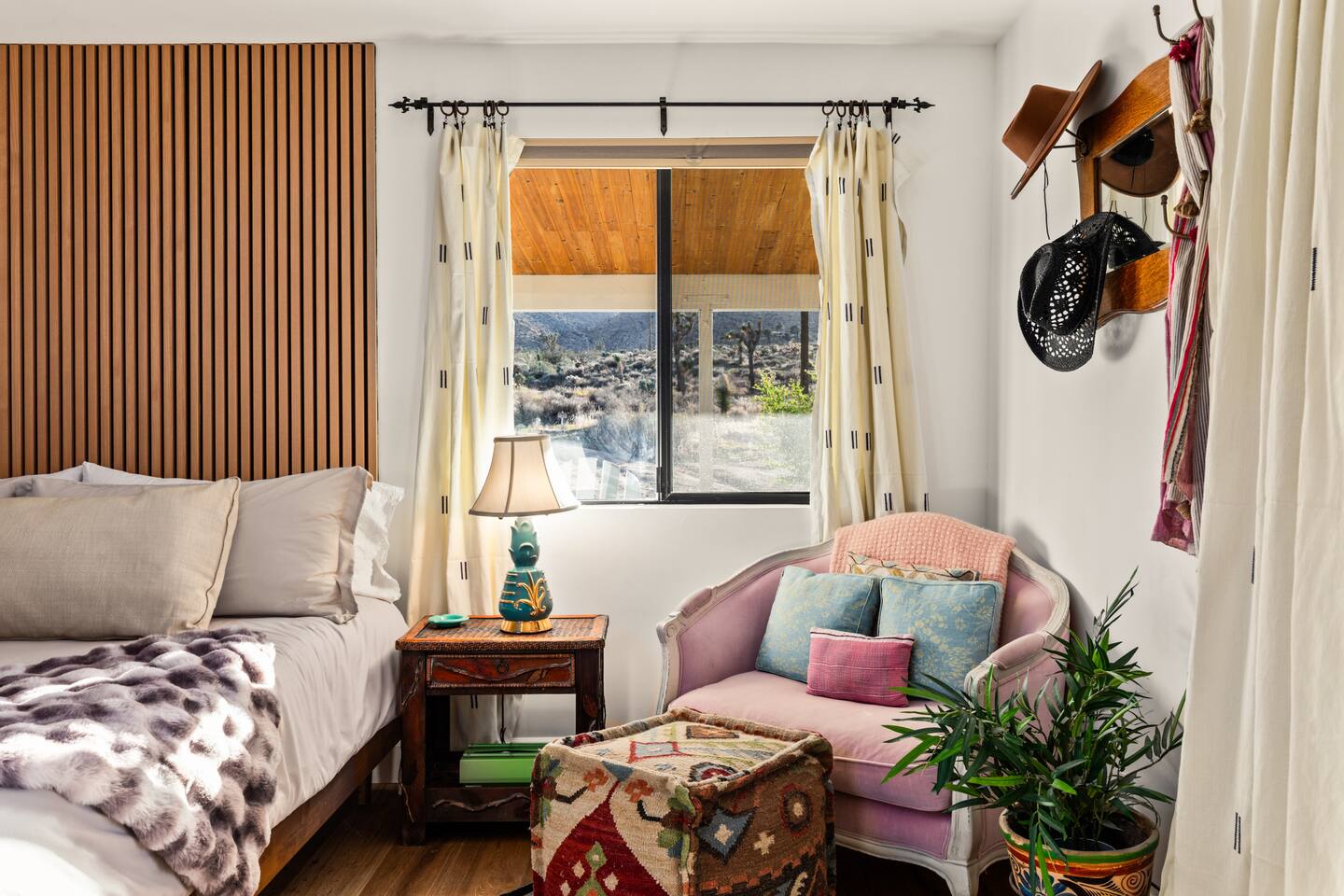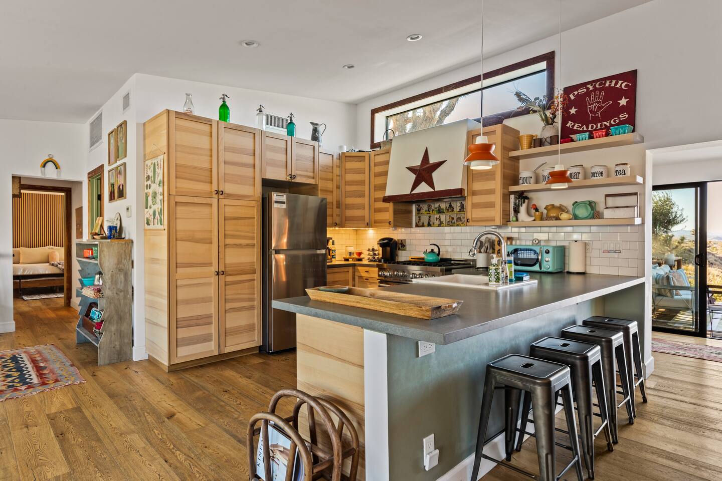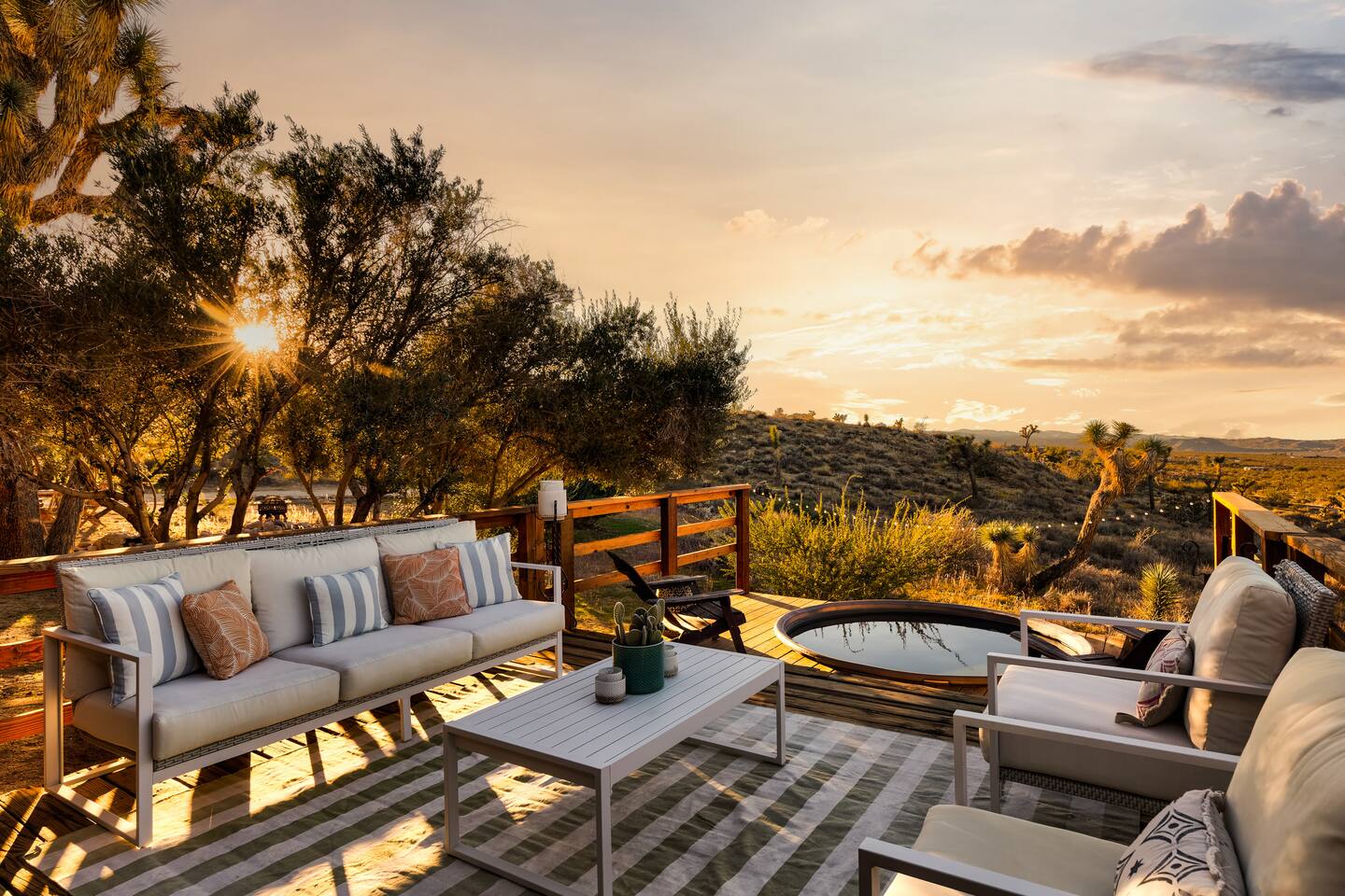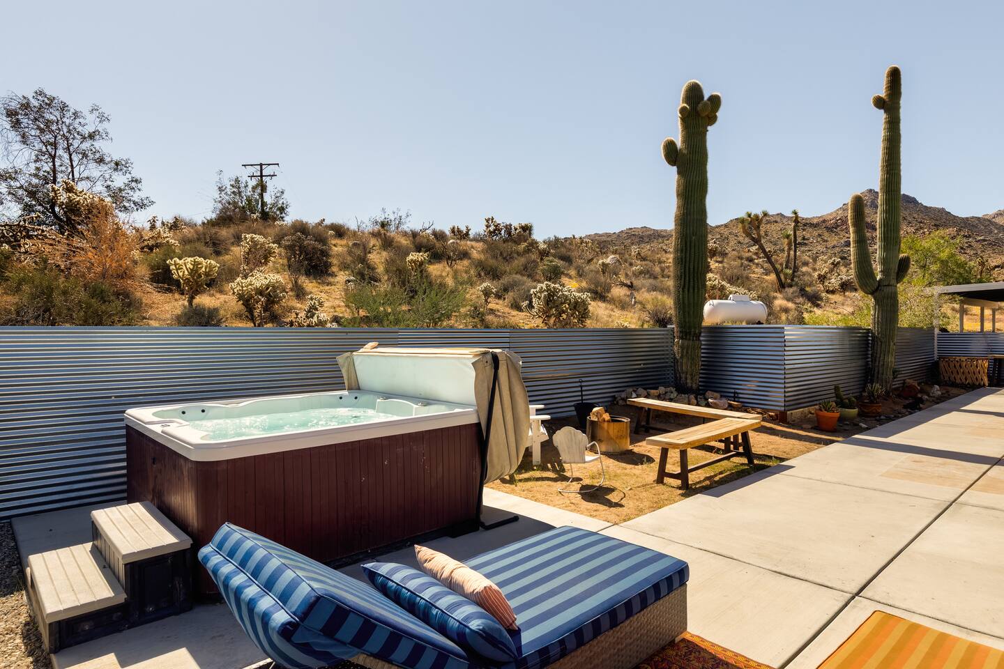 ☆☆ HIGHLIGHTS ☆☆ ✹ Designer property: recently redesigned by architect Duane Smith ✹ Total privacy in the heart of the desert: 2.5 private acres of solitude ✹ 3 spacious bedrooms: 2 kings + 1 queen ✹ 2 full bathrooms: essential toiletries provided ✹ Full kitchen w/ modern appliances ✹ Complimentary coffee bar ✹ Family-friendly: high chair, pack n’ play, children’s dinnerware, and more ✹ Spacious living area w/ flat-screen smart TV, record player, piano + more ✹ High-speed wifi + dedicated workspace ✹ Private hot tub + Cowboy Pool built into extensive front porch ✹ Panoramic views of the mountains + desert ✹ BBQ grill + outdoor dining space ✹ SoloStove firepit with 4 Adirondack chairs ✹ Lounge space in the sun + shade ✹ Dark skies: perfect for stargazing ✹ Pet-friendly ✹ A/C and heating throughout the home ✹ Washer + dryer ✹ Free parking: a covered area for 2 vehicles + additional parking in the driveway ✹ Local recommendations from the host ✹ Daily housekeeping available (subject to additional fees) ✹ Easy access to local attractions: minutes to the national park entrance Eager to Read More? Here Are A Few Kind Words From Our Previous Guests: “An absolute gem of a home located minutes away from the front gates a Joshua tree. It is rare to find an air bnb where you immediately feel “at home” upon walking inside. The design of this home has so much character and charm with an obvious attention to detail. The hosts are very accommodating and wanted us to have the best experience possible. We are fairly local and are already planning our trip back.” - Cris “This home was spotless, beautifully decorated, and exactly as described. Amazing views off the front porch of the surrounding mountains. The location was ideal—super close to the west gate of Joshua Tree park and also close to restaurants and shops in town, but still quiet and peaceful. The host was incredibly responsive and friendly, and provided excellent local recommendations. The beds were super comfortable, Wifi was great speed for a desert home, a fully stocked kitchen, and enclosed outdoor space felt very private and serene. It had two of the biggest cacti I’ve ever seen up close! We’d definitely stay here again and highly recommend it to anyone looking for a relaxing and hassle-free experience!” - Nick “This place was fantastic. I’ve been to Joshua tree over 10 times and this place was the perfect mix of value, proximity to the park, being secluded enough and amenities at the house. If your thinking about staying in Joshua tree don’t think twice about booking here” - Ciaran ★★ BEDROOMS ★★ Three sun-soaked bedrooms provide a bright and airy space to relax after a long day on the go. Each bedroom boasts a comfortable bed, extra pillows and blankets, and blackout curtains to help you enjoy a restful night even when you want to sleep in! Bedroom 1: King-sized bed, ensuite bathroom, direct access to front patio Bedroom 2: King-sized bed Bedroom 3: Queen-sized bed, direct access to outdoor patio ✔ Extra pillows + blankets ✔ A/C in each bedroom ✔ Blackout curtains ★★ BATHROOMS ★★ The primary bedroom has a charming bathroom, and one additional full bath is located off the main living area. Both bathrooms are sparkling clean and beautifully decorated to provide a relaxing experience. Don’t miss bathing in the clawfoot tub directly under a skylight with a view of the incredible starry sky! ✹Bathroom 1: Ensuite to the primary bedroom with a clawfoot bathtub, massive walk-in shower, and dual sinks ✹Bathroom 2: Full bathroom with a walk-in shower ✔ Essential toiletries provided (including shampoo, conditioner and body wash) ✔ Hair dryer ✔ Fresh towels ✔ Laundry room ★★ KITCHEN & DINING ★★ The modern kitchen is a chef’s dream with stainless steel appliances, spacious countertops, and an open concept that makes it easy to mingle with the whole group even while preparing meals. ✔ Fully stocked kitchen w/ modern appliances ✔ Complimentary coffee bar ✔ Basic cookware & dinnerware ✔ Oversized dining table w/ seating for 8 ✔ High chair for kids ★★ LIVING ROOM ★★ Featuring an expansive lounge space, this home offers plenty of opportunities to relax in between exploring nearby attractions. Sink into the comfy sofa and stream your favorite shows and movies on the flat-screen smart TV, or enjoy a digital detox as you read a book, spin some vinyl, or play a tune on the piano. ✔ Multiple lounge spaces w/ comfy sofas + chairs ✔ Dedicated workspace ✔ Decorative fireplace ✔ Piano + vinyl player ✔ Flat-screen smart TV ✔ Books + boardgames ★★ OUTDOOR SPACE ★★ The inside of the home is a design lover's dream, and the outdoor space is a sanctuary for nature lovers. Admire the starry night sky and Milky Way, unwind in the private hot tub, or soak up the sun from a lounger. Sweeping views surround the entire property, making this private desert retreat the perfect destination. ✔ Private hot tub + cowboy pool ✔ Sun loungers ✔ BBQ grill + outdoor dining ✔ Stunning views of the desert + mountains ✔ Dark skies: perfect for stargazing ★★ ACTIVITIES/ATTRACTIONS ★★ Once you’re ready to get out and explore the high desert, you’ll find nearby attractions like the national park and downtown Joshua Tree just a stone’s throw away. Here are some of our favorite activities and attractions nearby: Outdoor & Nature Activities Explore iconic desert landscapes, scenic hikes, and wildlife viewing spots: ✔ Joshua Tree National Park West Entrance – 1.9 miles ✔ Barker Dam Trail – 6 miles ✔ Hidden Valley – 11.2 miles Art & Culture Discover Joshua Tree's vibrant art scene and unique installations: ✔ Joshua Tree Art Gallery (JTAG) – 3.4 miles ✔ Noah Purifoy Outdoor Desert Art Museum – 8.8 miles ✔ Art Queen & World Famous Crochet Museum – 3.2 miles ✔ La Matadora Gallery – 3.3 