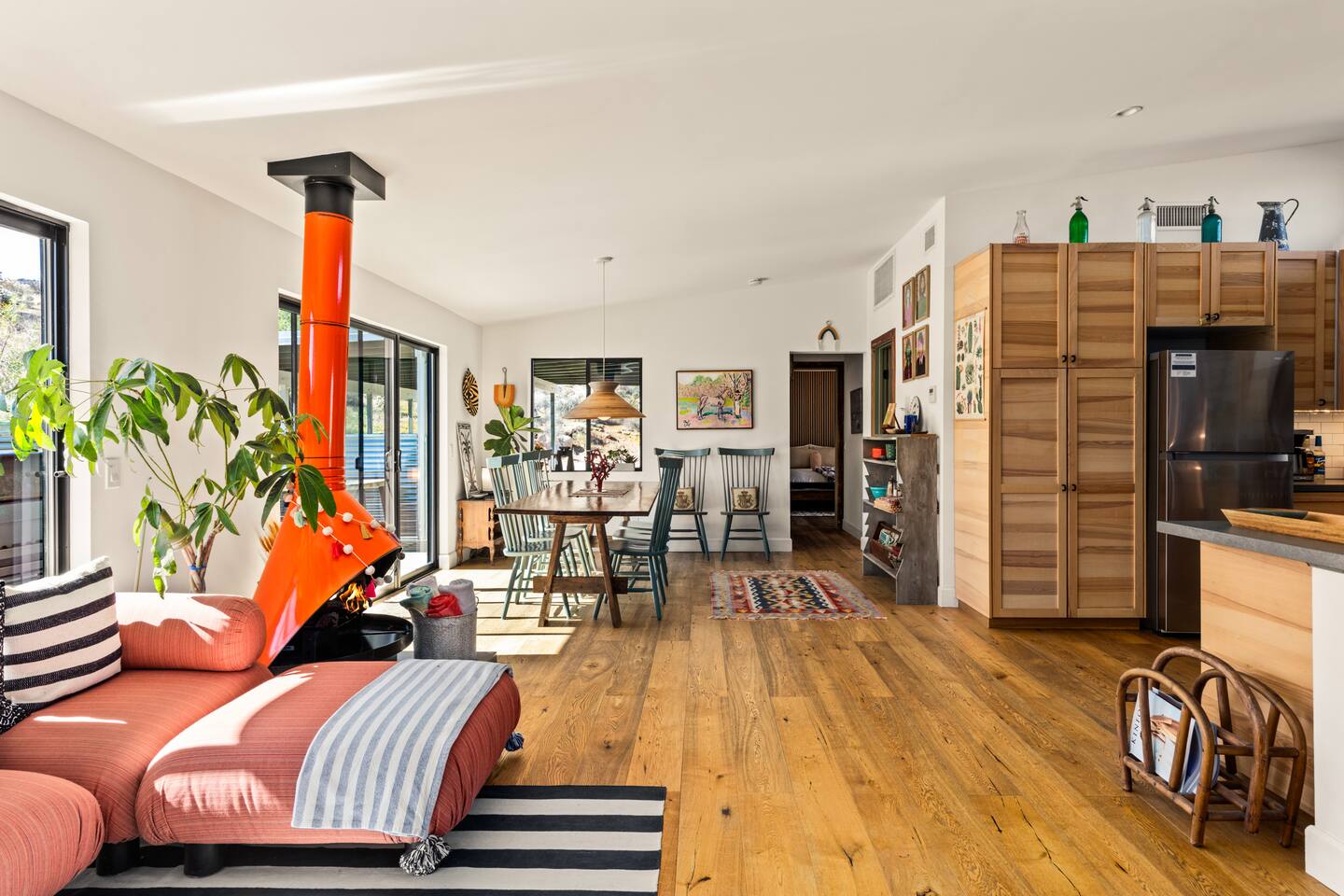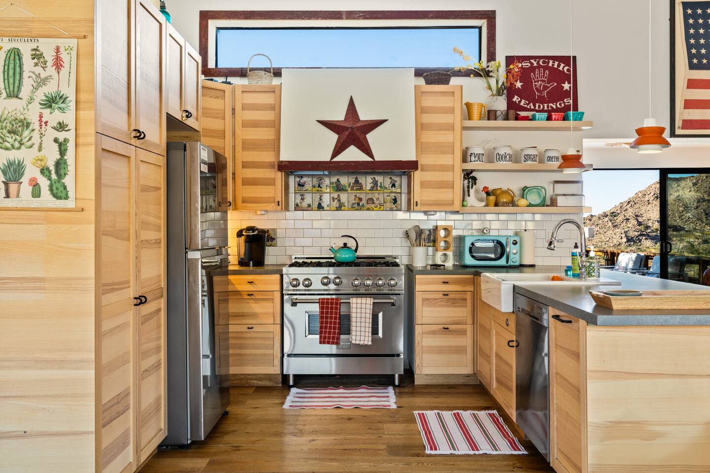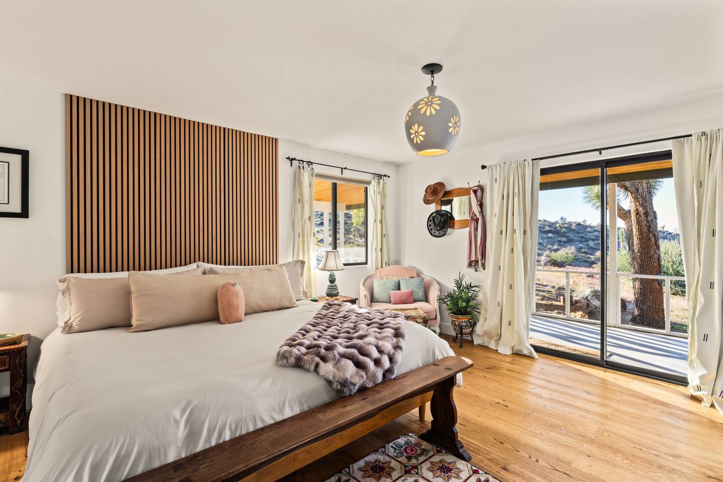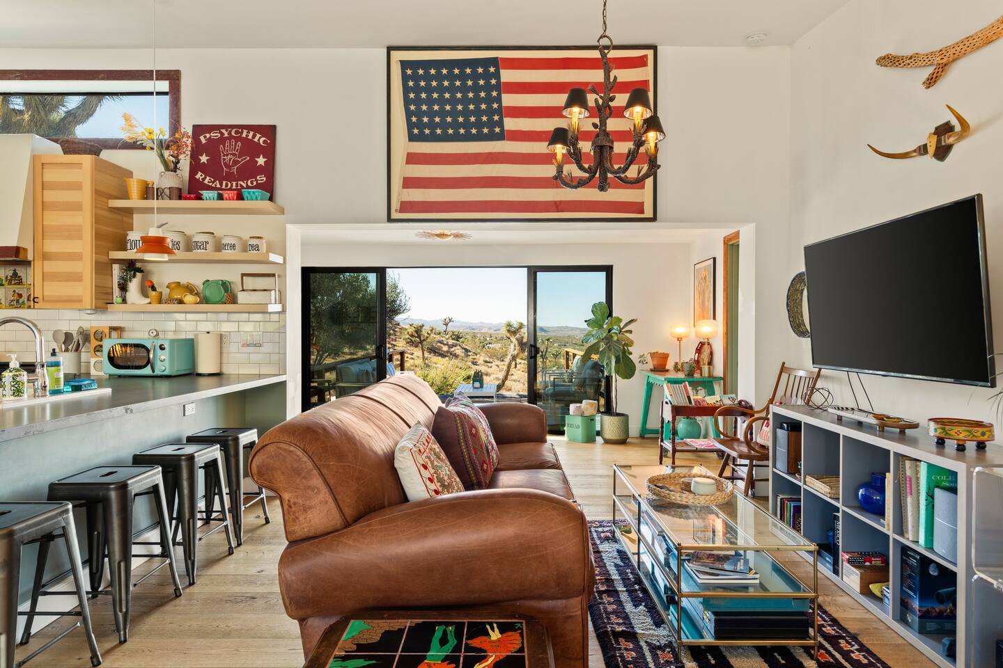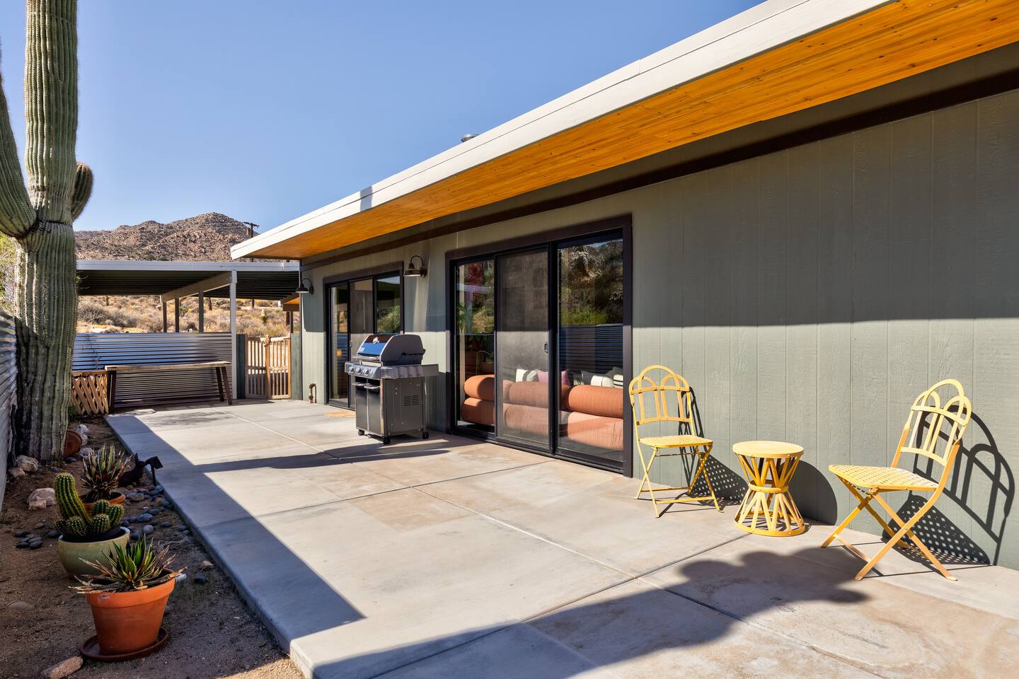 ☆☆ HIGHLIGHTS ☆☆ ✹ Designer property: recently redesigned by architect Duane Smith ✹ Total privacy in the heart of the desert: 2.5 private acres of solitude ✹ 3 spacious bedrooms: 2 kings + 1 queen ✹ 2 full bathrooms: essential toiletries provided ✹ Full kitchen w/ modern appliances ✹ Complimentary coffee bar ✹ Family-friendly: high chair, pack n’ play, children’s dinnerware, and more ✹ Spacious living area w/ flat-screen smart TV, record player, piano + more ✹ High-speed wifi + dedicated workspace ✹ Private hot tub + Cowboy Pool built into extensive front porch ✹ Panoramic views of the mountains + desert ✹ BBQ grill + outdoor dining space ✹ SoloStove firepit with 4 Adirondack chairs ✹ Lounge space in the sun + shade ✹ Dark skies: perfect for stargazing ✹ Pet-friendly ✹ A/C and heating throughout the home ✹ Washer + dryer ✹ Free parking: a covered area for 2 vehicles + additional parking in the driveway ✹ Local recommendations from the host ✹ Daily housekeeping available (subject to additional fees) ✹ Easy access to local attractions: minutes to the national park entrance Eager to Read More? Here Are A Few Kind Words From Our Previous Guests: “An absolute gem of a home located minutes away from the front gates a Joshua tree. It is rare to find an air bnb where you immediately feel “at home” upon walking inside. The design of this home has so much character and charm with an obvious attention to detail. The hosts are very accommodating and wanted us to have the best experience possible. We are fairly local and are already planning our trip back.” - Cris “This home was spotless, beautifully decorated, and exactly as described. Amazing views off the front porch of the surrounding mountains. The location was ideal—super close to the west gate of Joshua Tree park and also close to restaurants and shops in town, but still quiet and peaceful. The host was incredibly responsive and friendly, and provided excellent local recommendations. The beds were super comfortable, Wifi was great speed for a desert home, a fully stocked kitchen, and enclosed outdoor space felt very private and serene. It had two of the biggest cacti I’ve ever seen up close! We’d definitely stay here again and highly recommend it to anyone looking for a relaxing and hassle-free experience!” - Nick “This place was fantastic. I’ve been to Joshua tree over 10 times and this place was the perfect mix of value, proximity to the park, being secluded enough and amenities at the house. If your thinking about staying in Joshua tree don’t think twice about booking here” - Ciaran ★★ BEDROOMS ★★ Three sun-soaked bedrooms provide a bright and airy space to relax after a long day on the go. Each bedroom boasts a comfortable bed, extra pillows and blankets, and blackout curtains to help you enjoy a restful night even when you want to sleep in! Bedroom 1: King-sized bed, ensuite bathroom, direct access to front patio Bedroom 2: King-sized bed Bedroom 3: Queen-sized bed, direct access to outdoor patio ✔ Extra pillows + blankets ✔ A/C in each bedroom ✔ Blackout curtains ★★ BATHROOMS ★★ The primary bedroom has a charming bathroom, and one additional full bath is located off the main living area. Both bathrooms are sparkling clean and beautifully decorated to provide a relaxing experience. Don’t miss bathing in the clawfoot tub directly under a skylight with a view of the incredible starry sky! ✹Bathroom 1: Ensuite to the primary bedroom with a clawfoot bathtub, massive walk-in shower, and dual sinks ✹Bathroom 2: Full bathroom with a walk-in shower ✔ Essential toiletries provided (including shampoo, conditioner and body wash) ✔ Hair dryer ✔ Fresh towels ✔ Laundry room ★★ KITCHEN & DINING ★★ The modern kitchen is a chef’s dream with stainless steel appliances, spacious countertops, and an open concept that makes it easy to mingle with the whole group even while preparing meals. ✔ Fully stocked kitchen w/ modern appliances ✔ Complimentary coffee bar ✔ Basic cookware & dinnerware ✔ Oversized dining table w/ seating for 8 ✔ High chair for kids ★★ LIVING ROOM ★★ Featuring an expansive lounge space, this home offers plenty of opportunities to relax in between exploring nearby attractions. Sink into the comfy sofa and stream your favorite shows and movies on the flat-screen smart TV, or enjoy a digital detox as you read a book, spin some vinyl, or play a tune on the piano. ✔ Multiple lounge spaces w/ comfy sofas + chairs ✔ Dedicated workspace ✔ Decorative fireplace ✔ Piano + vinyl player ✔ Flat-screen smart TV ✔ Books + boardgames ★★ OUTDOOR SPACE ★★ The inside of the home is a design lover's dream, and the outdoor space is a sanctuary for nature lovers. Admire the starry night sky and Milky Way, unwind in the private hot tub, or soak up the sun from a lounger. Sweeping views surround the entire property, making this private desert retreat the perfect destination. ✔ Private hot tub + cowboy pool ✔ Sun loungers ✔ BBQ grill + outdoor dining ✔ Stunning views of the desert + mountains ✔ Dark skies: perfect for stargazing ★★ ACTIVITIES/ATTRACTIONS ★★ Once you’re ready to get out and explore the high desert, you’ll find nearby attractions like the national park and downtown Joshua Tree just a stone’s throw away. Here are some of our favorite activities and attractions nearby: Outdoor & Nature Activities Explore iconic desert landscapes, scenic hikes, and wildlife viewing spots: ✔ Joshua Tree National Park West Entrance – 1.9 miles ✔ Barker Dam Trail – 6 miles ✔ Hidden Valley – 11.2 miles Art & Culture Discover Joshua Tree's vibrant art scene and unique installations: ✔ Joshua Tree Art Gallery (JTAG) – 3.4 miles ✔ Noah Purifoy Outdoor Desert Art Museum – 8.8 miles ✔ Art Queen & World Famous Crochet Museum – 3.2 miles ✔ La Matadora Gallery – 3.3 