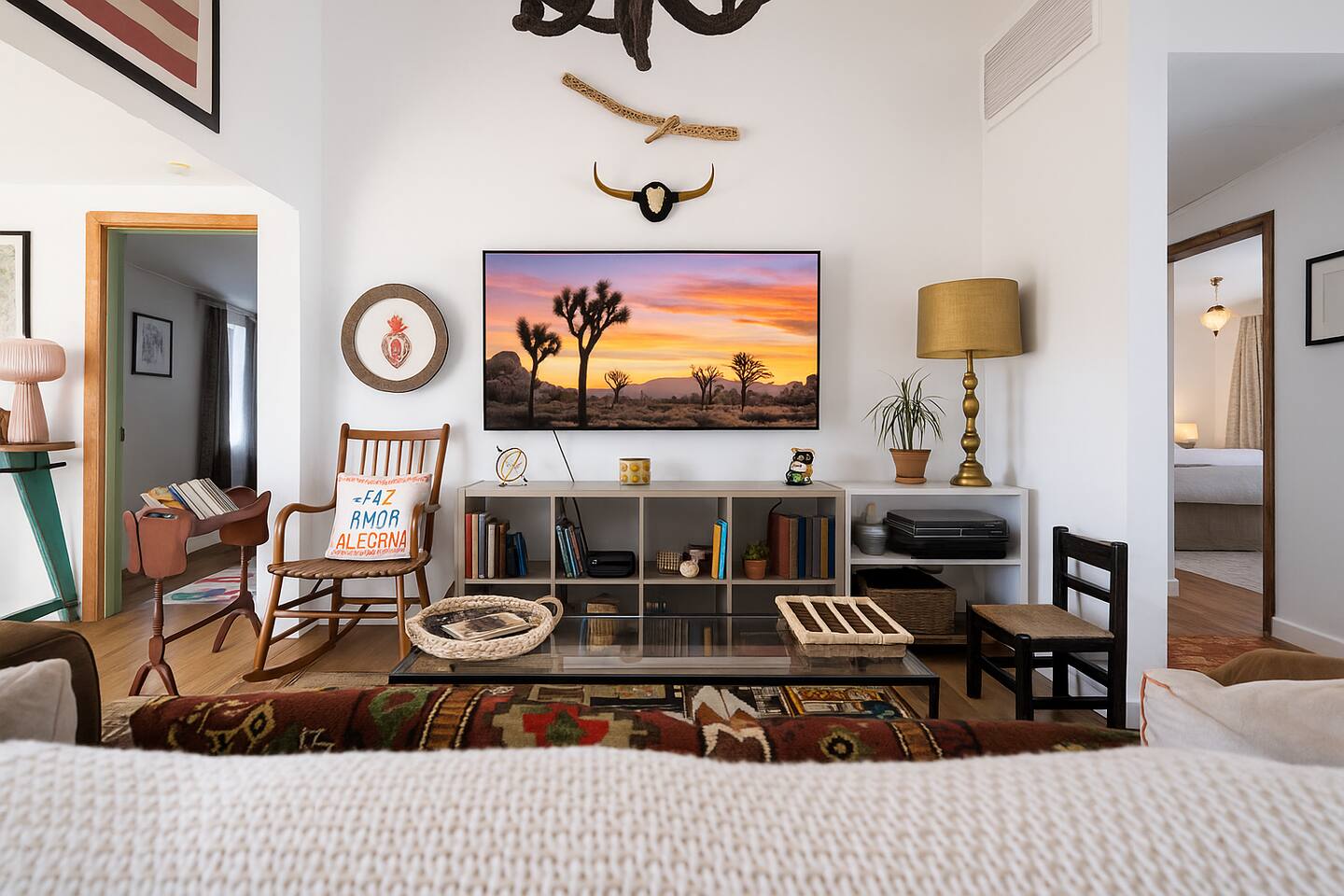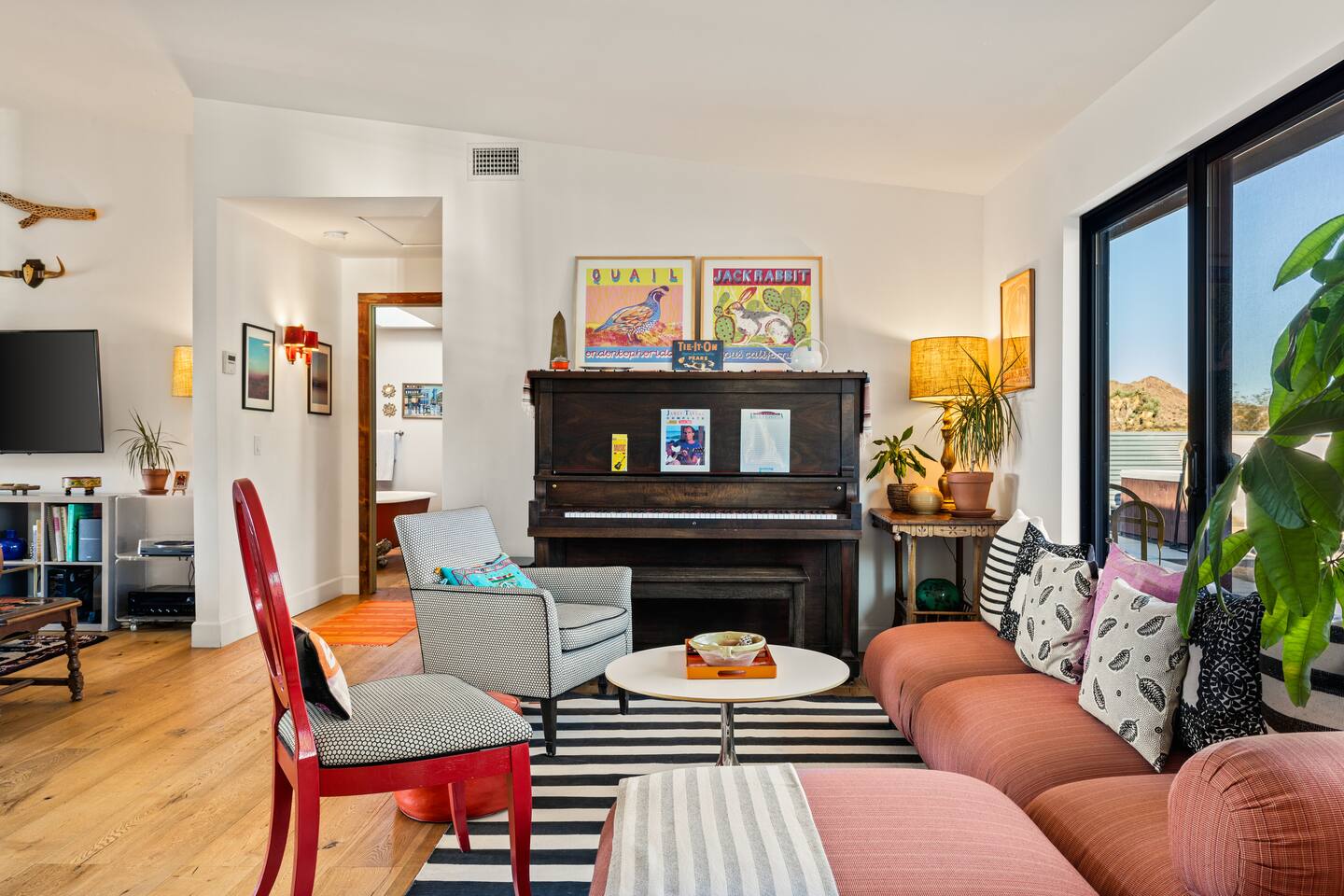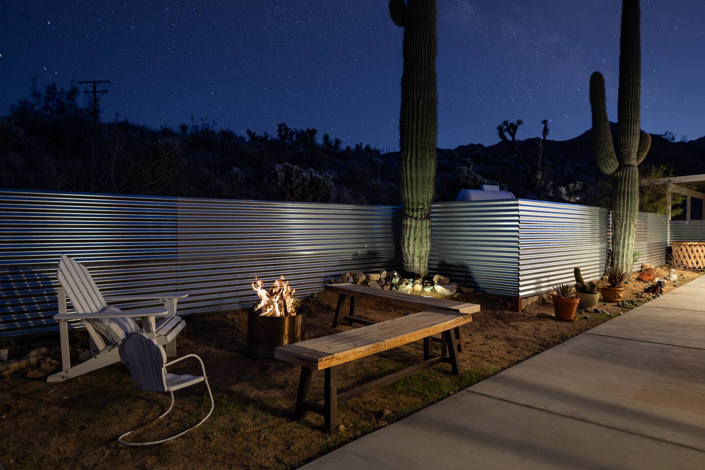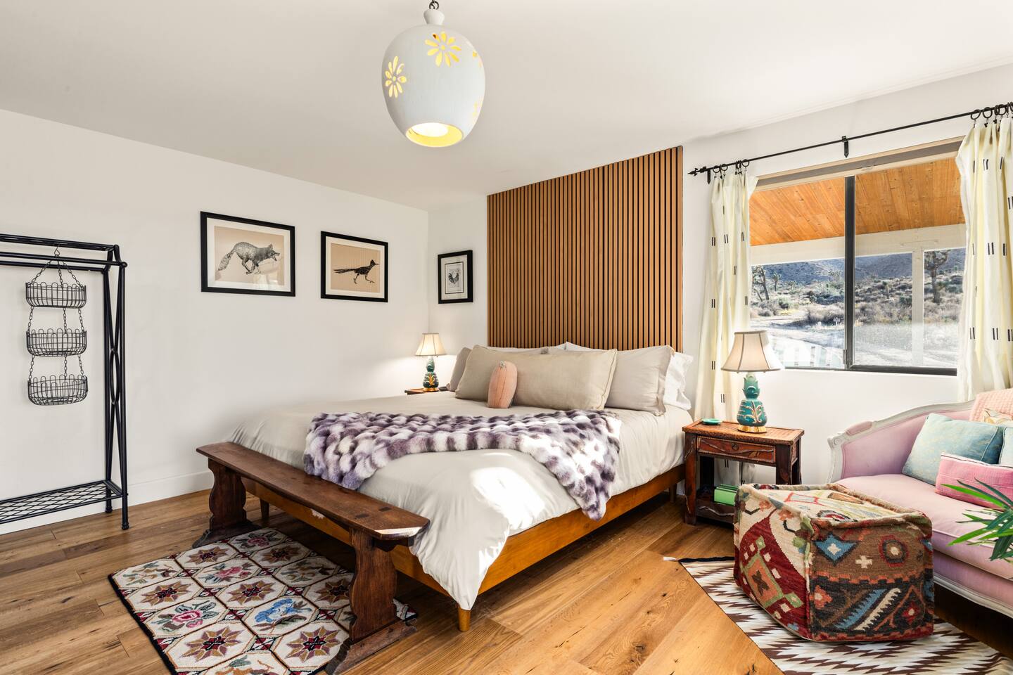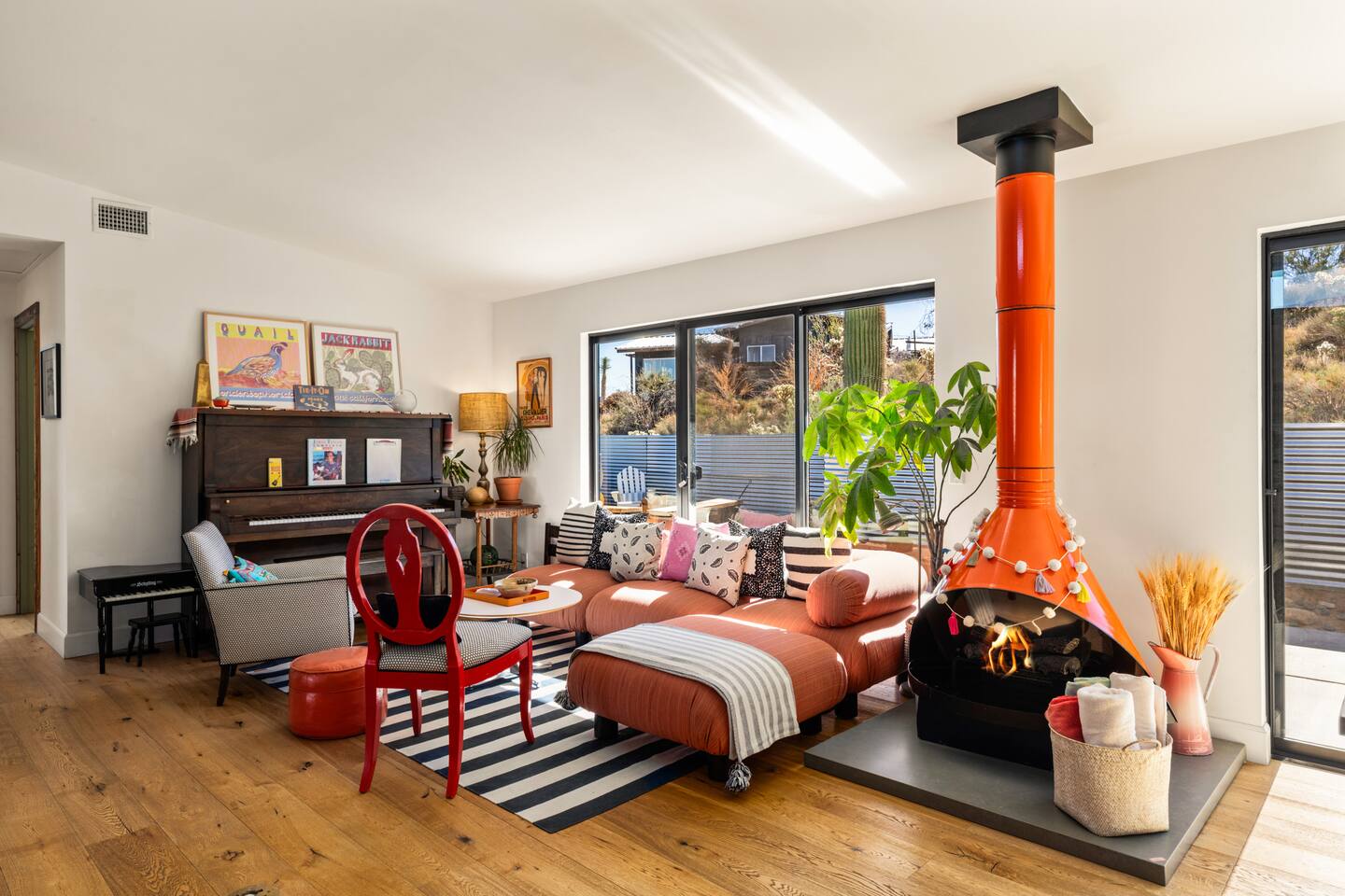 ☆☆ HIGHLIGHTS ☆☆ ✹ Designer property: recently redesigned by architect Duane Smith ✹ Total privacy in the heart of the desert: 2.5 private acres of solitude ✹ 3 spacious bedrooms: 2 kings + 1 queen ✹ 2 full bathrooms: essential toiletries provided ✹ Full kitchen w/ modern appliances ✹ Complimentary coffee bar ✹ Family-friendly: high chair, pack n’ play, children’s dinnerware, and more ✹ Spacious living area w/ flat-screen smart TV, record player, piano + more ✹ High-speed wifi + dedicated workspace ✹ Private hot tub + Cowboy Pool built into extensive front porch ✹ Panoramic views of the mountains + desert ✹ BBQ grill + outdoor dining space ✹ SoloStove firepit with 4 Adirondack chairs ✹ Lounge space in the sun + shade ✹ Dark skies: perfect for stargazing ✹ Pet-friendly ✹ A/C and heating throughout the home ✹ Washer + dryer ✹ Free parking: a covered area for 2 vehicles + additional parking in the driveway ✹ Local recommendations from the host ✹ Daily housekeeping available (subject to additional fees) ✹ Easy access to local attractions: minutes to the national park entrance Eager to Read More? Here Are A Few Kind Words From Our Previous Guests: “An absolute gem of a home located minutes away from the front gates a Joshua tree. It is rare to find an air bnb where you immediately feel “at home” upon walking inside. The design of this home has so much character and charm with an obvious attention to detail. The hosts are very accommodating and wanted us to have the best experience possible. We are fairly local and are already planning our trip back.” - Cris “This home was spotless, beautifully decorated, and exactly as described. Amazing views off the front porch of the surrounding mountains. The location was ideal—super close to the west gate of Joshua Tree park and also close to restaurants and shops in town, but still quiet and peaceful. The host was incredibly responsive and friendly, and provided excellent local recommendations. The beds were super comfortable, Wifi was great speed for a desert home, a fully stocked kitchen, and enclosed outdoor space felt very private and serene. It had two of the biggest cacti I’ve ever seen up close! We’d definitely stay here again and highly recommend it to anyone looking for a relaxing and hassle-free experience!” - Nick “This place was fantastic. I’ve been to Joshua tree over 10 times and this place was the perfect mix of value, proximity to the park, being secluded enough and amenities at the house. If your thinking about staying in Joshua tree don’t think twice about booking here” - Ciaran ★★ BEDROOMS ★★ Three sun-soaked bedrooms provide a bright and airy space to relax after a long day on the go. Each bedroom boasts a comfortable bed, extra pillows and blankets, and blackout curtains to help you enjoy a restful night even when you want to sleep in! Bedroom 1: King-sized bed, ensuite bathroom, direct access to front patio Bedroom 2: King-sized bed Bedroom 3: Queen-sized bed, direct access to outdoor patio ✔ Extra pillows + blankets ✔ A/C in each bedroom ✔ Blackout curtains ★★ BATHROOMS ★★ The primary bedroom has a charming bathroom, and one additional full bath is located off the main living area. Both bathrooms are sparkling clean and beautifully decorated to provide a relaxing experience. Don’t miss bathing in the clawfoot tub directly under a skylight with a view of the incredible starry sky! ✹Bathroom 1: Ensuite to the primary bedroom with a clawfoot bathtub, massive walk-in shower, and dual sinks ✹Bathroom 2: Full bathroom with a walk-in shower ✔ Essential toiletries provided (including shampoo, conditioner and body wash) ✔ Hair dryer ✔ Fresh towels ✔ Laundry room ★★ KITCHEN & DINING ★★ The modern kitchen is a chef’s dream with stainless steel appliances, spacious countertops, and an open concept that makes it easy to mingle with the whole group even while preparing meals. ✔ Fully stocked kitchen w/ modern appliances ✔ Complimentary coffee bar ✔ Basic cookware & dinnerware ✔ Oversized dining table w/ seating for 8 ✔ High chair for kids ★★ LIVING ROOM ★★ Featuring an expansive lounge space, this home offers plenty of opportunities to relax in between exploring nearby attractions. Sink into the comfy sofa and stream your favorite shows and movies on the flat-screen smart TV, or enjoy a digital detox as you read a book, spin some vinyl, or play a tune on the piano. ✔ Multiple lounge spaces w/ comfy sofas + chairs ✔ Dedicated workspace ✔ Decorative fireplace ✔ Piano + vinyl player ✔ Flat-screen smart TV ✔ Books + boardgames ★★ OUTDOOR SPACE ★★ The inside of the home is a design lover's dream, and the outdoor space is a sanctuary for nature lovers. Admire the starry night sky and Milky Way, unwind in the private hot tub, or soak up the sun from a lounger. Sweeping views surround the entire property, making this private desert retreat the perfect destination. ✔ Private hot tub + cowboy pool ✔ Sun loungers ✔ BBQ grill + outdoor dining ✔ Stunning views of the desert + mountains ✔ Dark skies: perfect for stargazing ★★ ACTIVITIES/ATTRACTIONS ★★ Once you’re ready to get out and explore the high desert, you’ll find nearby attractions like the national park and downtown Joshua Tree just a stone’s throw away. Here are some of our favorite activities and attractions nearby: Outdoor & Nature Activities Explore iconic desert landscapes, scenic hikes, and wildlife viewing spots: ✔ Joshua Tree National Park West Entrance – 1.9 miles ✔ Barker Dam Trail – 6 miles ✔ Hidden Valley – 11.2 miles Art & Culture Discover Joshua Tree's vibrant art scene and unique installations: ✔ Joshua Tree Art Gallery (JTAG) – 3.4 miles ✔ Noah Purifoy Outdoor Desert Art Museum – 8.8 miles ✔ Art Queen & World Famous Crochet Museum – 3.2 miles ✔ La Matadora Gallery – 3.3 